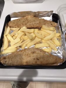 調理は、フタとタルタルソースを取り、アルミトレーのままオーブンで200℃ 25〜30分加熱するとのこと。
