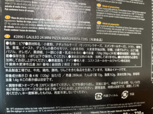 「小麦粉、ナチュラルチーズ、トマト、植物油、食塩、イースト、デュラム小麦のセモリナ、小麦麦芽粉、大麦麦芽抽出物、砂糖、小麦グルテン、ぶどう糖、バジル、オレガノ、黒胡椒(一部に小麦・乳成分を含む)」